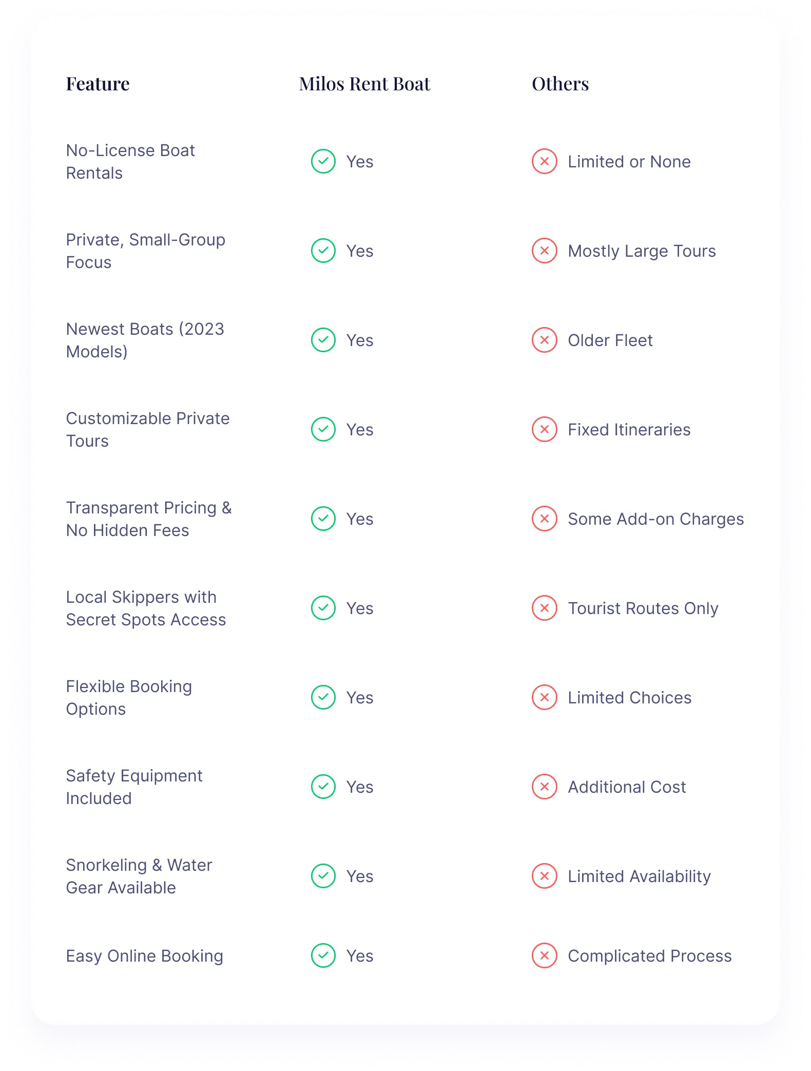 Milos Rent Boat offers a more flexible, premium, and private experience than large group tours, while still making boat rentals accessible to first-timers.